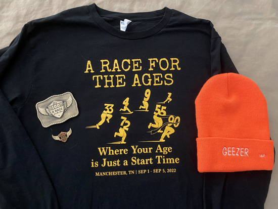 Race shirt, hat, 100-mile buckle, and 500-mile