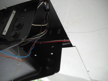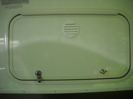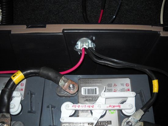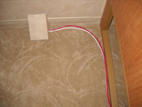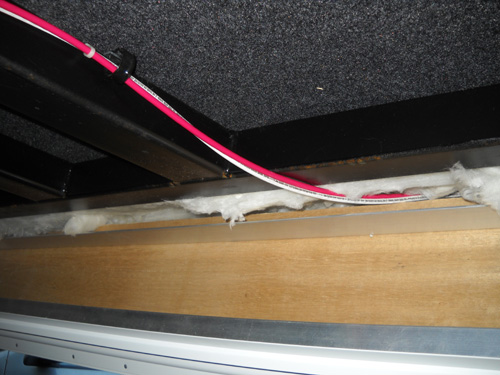 The # 10 wire from the panels entered the coach from the ceiling of the front closet. I tacked it down along the side wall of the closet, out of sight, and finally through this hole in the floor. This covered hole came with the unit and is used to feed other wiring to the front cap lights and the closet ceiling light (I assume).