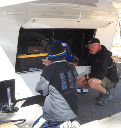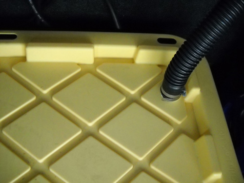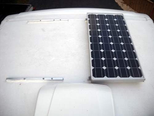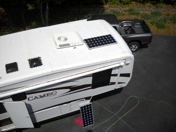 Solar Installation on 2010 Cameo 35SB3 We bought our 2010 Cameo 35SB3 in January 2010. I dismantled the solar equipment that was installed in our old fifth wheel and installed it in our new Cameo fifth wheel. Part of the work was done while we were camped at various campsites, mostly in Texas shortly after we took possession of the Cameo. The Trace Inverter, the batteries and the generator were done first. I waited until we got home to install the solar panels and charge controller, although I could have done them while on the road just as well. I found it convenient to have a Lowe's and Home Depot close to buy wire, various connectors and hardware. Here's the battery box I bought it at Home Depot for around $14.00. It's the 27 gallon size and it's supposed to hold 750 pounds. Four deep cycle batteries fit perfectly. Note the vent hose coming out of the right rear lid. That's to vent dangerous hydrogen gas.