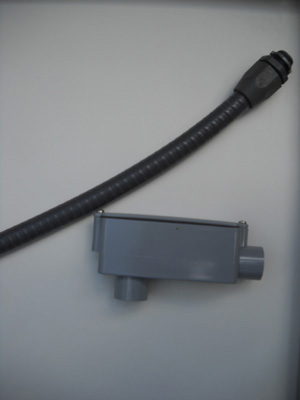Flexible conduit and 1/2" conduit box. The lower port on the box fits down into the hole drilled in the roof. The box is heavily caulked and held down with a 1" X 5/16" lag screw.