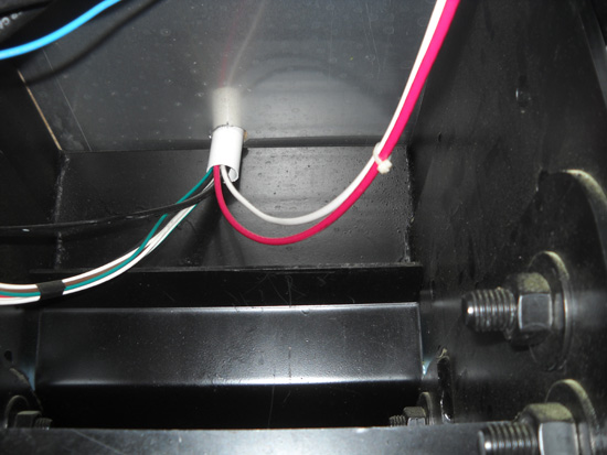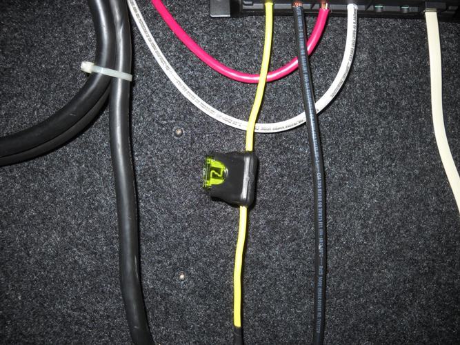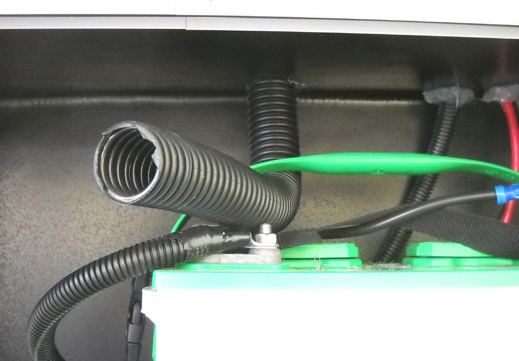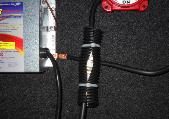This is the 250 amp catastrophic fuse with its protective cover. I made the cover from left over vent hose material and secured it with zip ties.