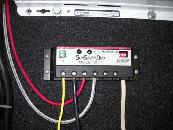 This is my new Morningstar Sun Saver Duo Charge Controller. Click here to read about it. My old CC didn't have a remote meter, which I think is important. If I know the batteries are getting low, I can start the generator or shut down some of the DC draw. I don't like discharging the batteries below 12.2 or 12.3 volts. The Sun Saver Duo is designed for RV applications. It will charge two different battery banks, the solar batteries and the coach battery.