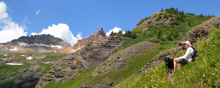 (Photo by Sue of Jim and Cody along the trail to Grant Swamp Pass near Silverton, CO)