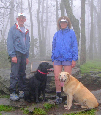 L: Jim, Sue, Cody, & Tater at Springer Mountain, GA, southern terminus of the AT, 4-30-05