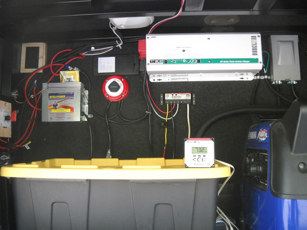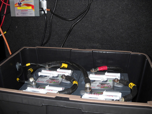 I have four Interstate U2200UT deep cycle batteries rated at 232 AH each. My previous Trojan T105 batteries worked well and lasted seven years. The Interstate batteries have a little higher AH rating, 232 vs 225 and I could get them locally when I needed them. Trojans back in 2003 = $67.95, Interstates in 2009 = $96.83. The Interstate price was at an Interstate distributor, not at a retail outlet. I've since replaced some of the heavy wiring with smaller gauge. Notice the weather strip around the top of the box to further seal it.