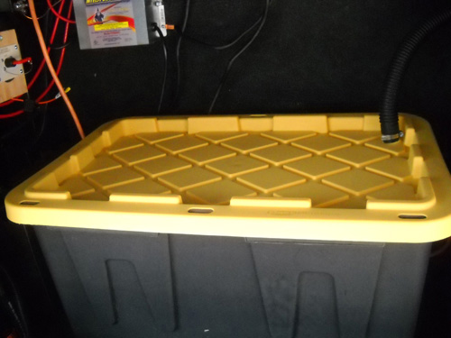 Solar Installation on 2010 Cameo 35SB3 We bought our 2010 Cameo 35SB3 in January 2010. I dismantled the solar equipment that was installed in our old fifth wheel and installed it in our new Cameo fifth wheel. Part of the work was done while we were camped at various campsites, mostly in Texas shortly after we took possession of the Cameo. The Trace Inverter, the batteries and the generator were done first. I waited until we got home to install the solar panels and charge controller, although I could have done them while on the road just as well. I found it convenient to have a Lowe's and Home Depot close to buy wire, various connectors and hardware. Here's the battery box I bought it at Home Depot for around $14.00. It's the 27 gallon size and it's supposed to hold 750 pounds. Four deep cycle batteries fit perfectly. Note the vent hose coming out of the right rear lid. That's to vent dangerous hydrogen gas.