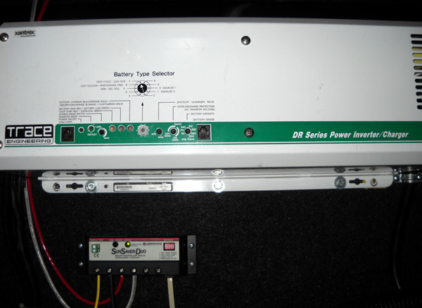 This is my Trace DR2412 Inverter Charger (and my Sun Saver Duo Charge Controller below). The 2412 is probably overkill and a little pricey for an RV system, but I bought it with the thought that should the solar components not work out in the RV, I could always install it in our house. I've been very happy with this unit. It's a four stage charger and a 2400 watt 12 volt inverter. The panel wires are seen in the upper left and down the side of the DR2412 to the Sun Saver Duo Charge Controller.