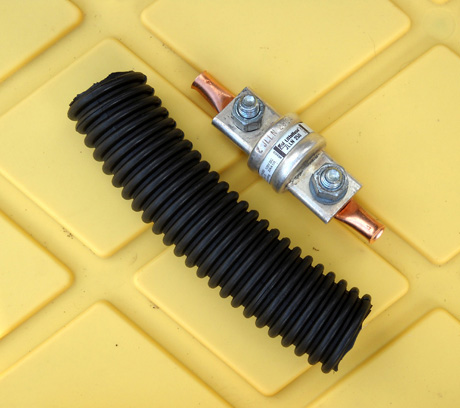 This is the 250 amp catastrophic fuse with its protective cover. I made the cover from left over vent hose material and secured it with zip ties.