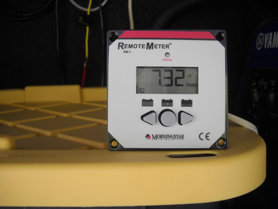 A close up of the Sun Saver Duo Remote Meter. It's showing the maximum solar amps from the panels.