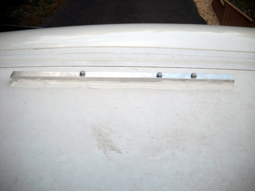 Front left tube mounted with three lag screws. I had four screws left over so decided to use them. I caulked the holes before I inserted the screws and all along the tubing with Dicor. I found Dicor hard to work with, but it works.