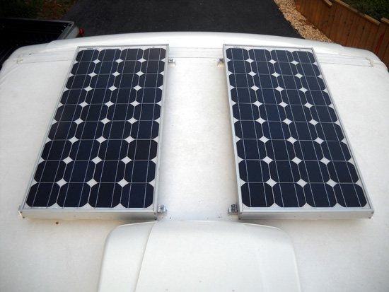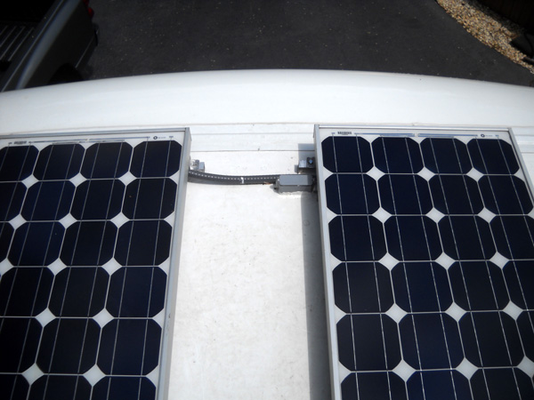 The flexible conduit connecting the two panels in parallel. Also seen is the weatherproof box where the wires enter the coach.
